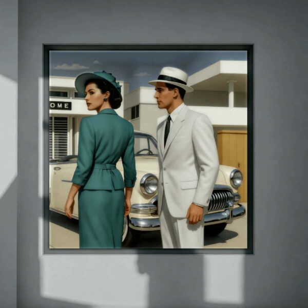 Descubre la magia del pasado con esta obra de arte original de Marco Antonio Díaz, parte de la Colección de Autor en Díaz de la Plata Studio. Este impresionante cuadro de 60×60 cm representa una pareja nostálgica posando con un elegante auto antiguo, evocando el encanto de la moda de los años 50. Los detalles vívidos y la paleta cromática cuidadosamente elaborada transportan al espectador a una época dorada, donde cada viaje estaba lleno de romance y aventuras. Ideal para quienes buscan una pieza única que enriquezca su hogar con un toque de sofisticación y estilo retro.